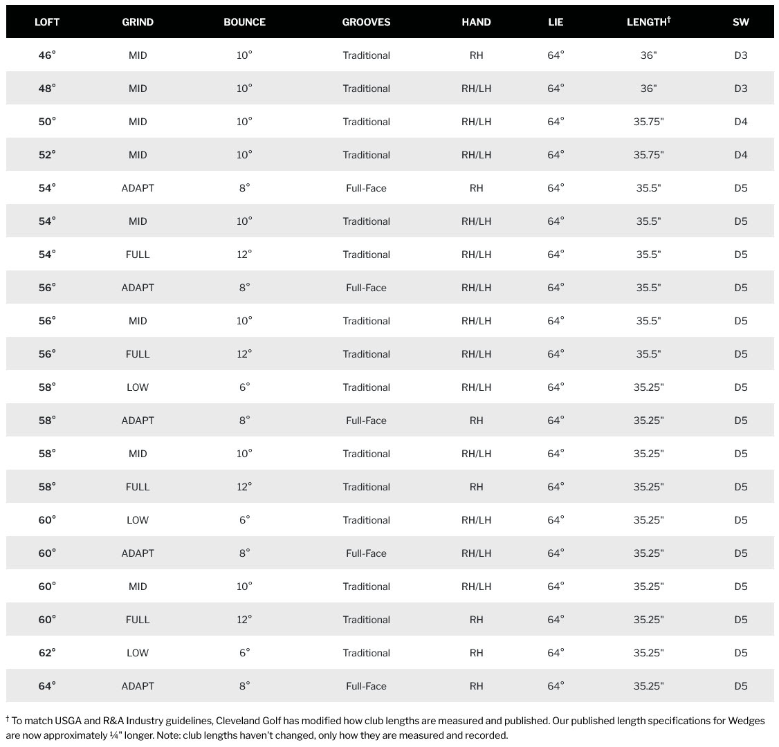 For classic groove length and head shape, select either FULL, MID, or LOW sole grinds. For Full-Face grooves and a higher toe profile, select the new ADAPT sole grind —the only full face groove option for this generation—crafted on tour for open-faced finesse shots.